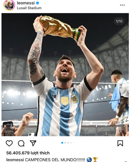 Rất nhanh sau đó thì chính hình ảnh mà Lionel Messi nâng cao chiếc cúp vàng tại World Cup 2022 đã nhận được kỷ lục là bức ảnh có nhiều lượt yêu thích nhất trên nền tảng mạng xã hội Instagram. Mặc dù chỉ là một bài đăng ăn mừng hết sức bình thường nhưng có lẽ chính Messi cũng không ngờ rằng nó lại thu hút nhiều lượt thích đến vậy. Nó còn vượt qua cả kỷ lục bài đăng của Ronaldo trước thềm chung kết và bức ảnh “quả trứng gà”.